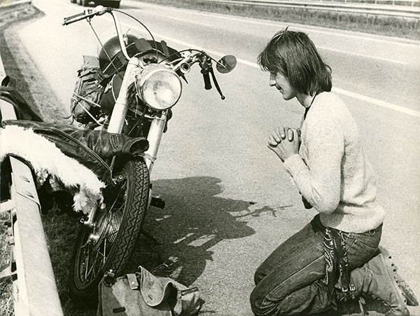 Die Reise war wettermäßig eine Katastrophe. Überwiegend Regen von Wien bis München. Heutzutage mit Goretex-Gewand nicht der Rede wert, aber 1975 kaufte man sich ein Motorrad, borgte sich von einem Bruder eine Uralt-Lederjacke, nahm den Helm vom Mopedfahren und fertig war die Bekleidungsfrage. Motorrad-Stiefel? Wasserdichte Hose?? Handschuhe, vielleicht sogar noch wasserdicht???